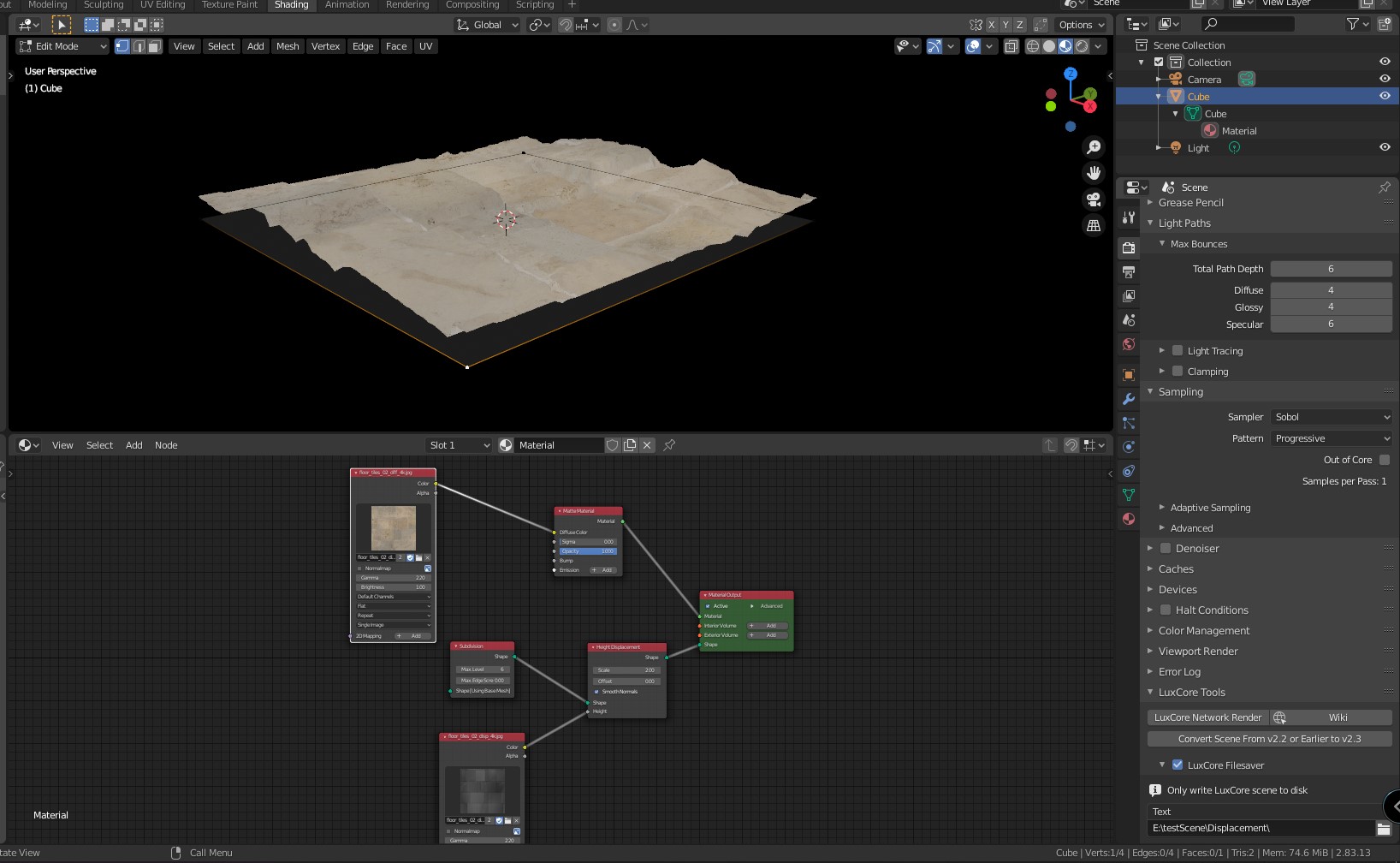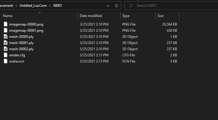 I see that's why there is 3 object instead of 2 when I save the scene by filesaver in a blender. honestly, I expect just 2 objects one for plane and one for displacement, and not 3.Dade wrote: Sat Mar 27, 2021 11:37 amBecause they are defined, even if not all used. In LuxCore, this is true for all geometries, textures, materials, etc.: if you define them they exist, even if not directly used in the current rendering (they may be in the future, after a scene edit).TAO wrote: Thu Mar 25, 2021 10:26 pmThank you for the explanation but why there are 3 objects exported by FileSaver?B.Y.O.B. wrote: Thu Mar 25, 2021 1:49 pm Filesaver won't help you investigate shapes anyway, it only saves the end result mesh of the shape evaluation.