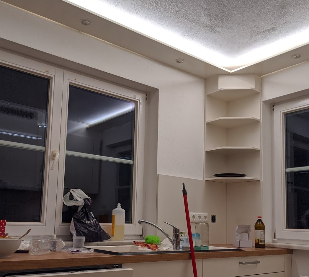 I'm trying to model the approximate / expected lighting condition for my kitchen, when I'm going to use a certain LED stripe. The results I get appear plausible to my untrained eye, but I would like to have some feedback on the correctness of this simulation and possible culprits / mistakes I have done in setting up my scene. I've attached a .blend file for someone else to use this, in case its somewhere close to being correct.