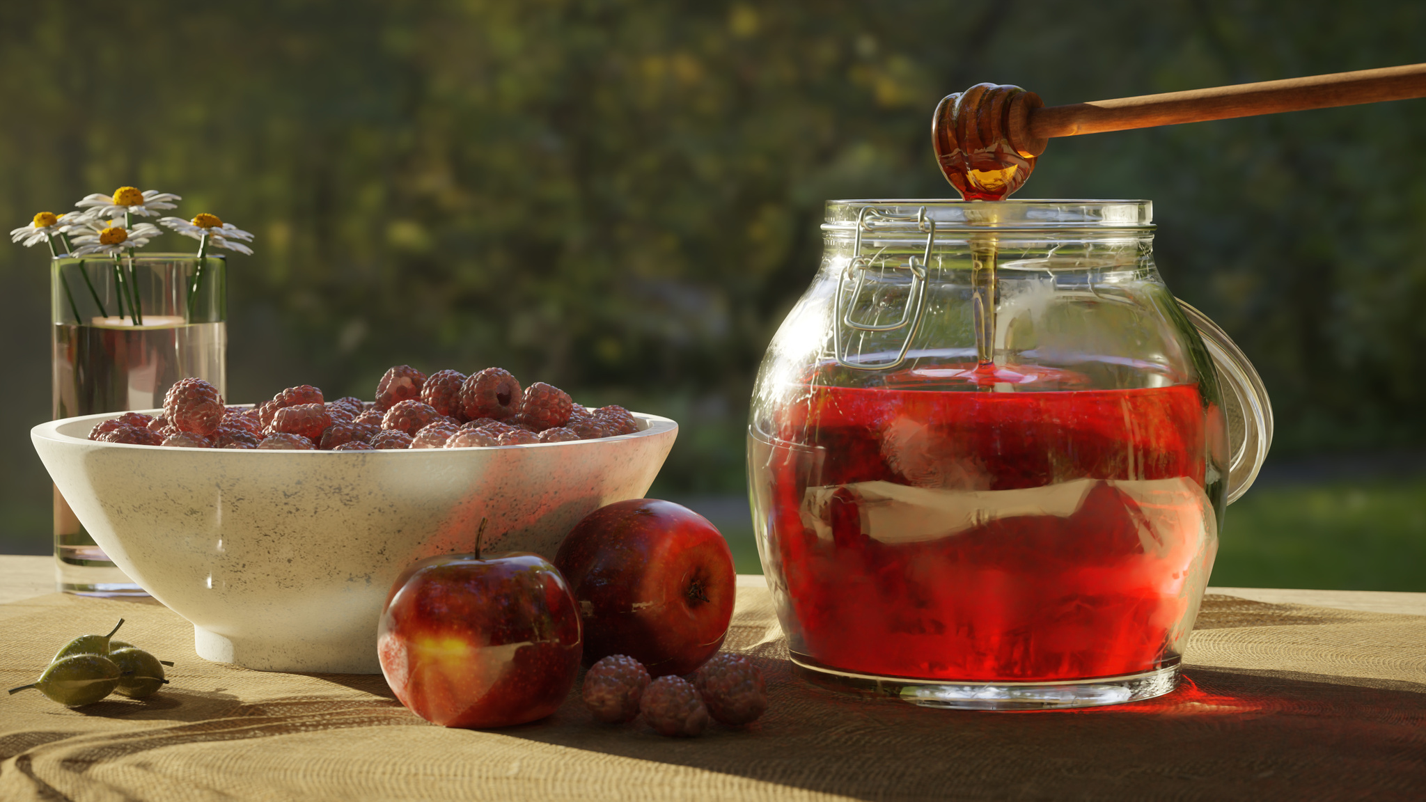 the honey pot is extremelly well done very realistics. A side note for improvement could be better shader on fruit ? the Apple a extremelly shiny and raspberry look strange. you can improve it by using lot of reference photo.