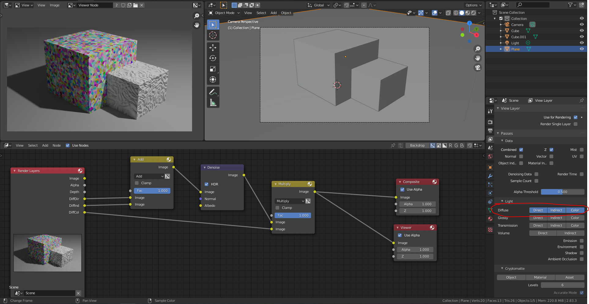 Then you can add the direct and indirect portions, denoise them, and multiply the result with the color part (which doesn't need denoising).
