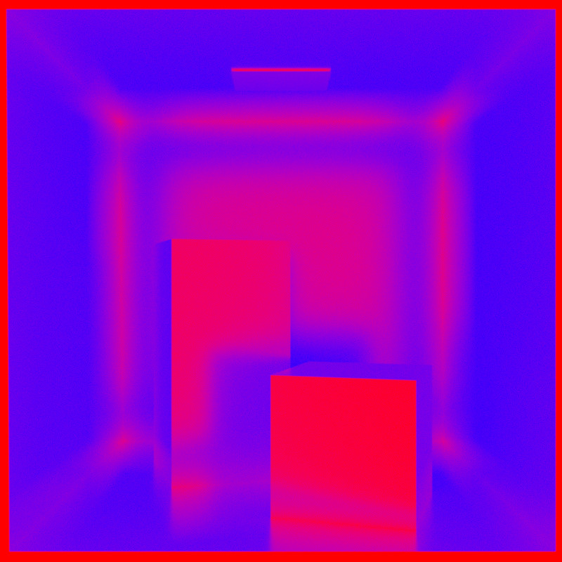 The red zone with 0.0 are there because Cornell scene is open and the rays bouncing over the front faces and hit the sky (as I wrote, the indirect cache can kick in only from the second bounce).