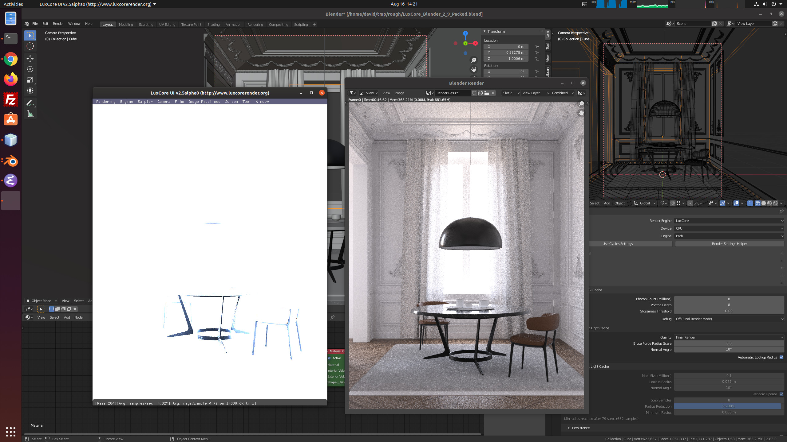 To avoid possible problems with the 2.9, I've opened the scene with 2.83.4 and, as the previous tests, I'm using latest BlendLuxCore 2.5 alpha.