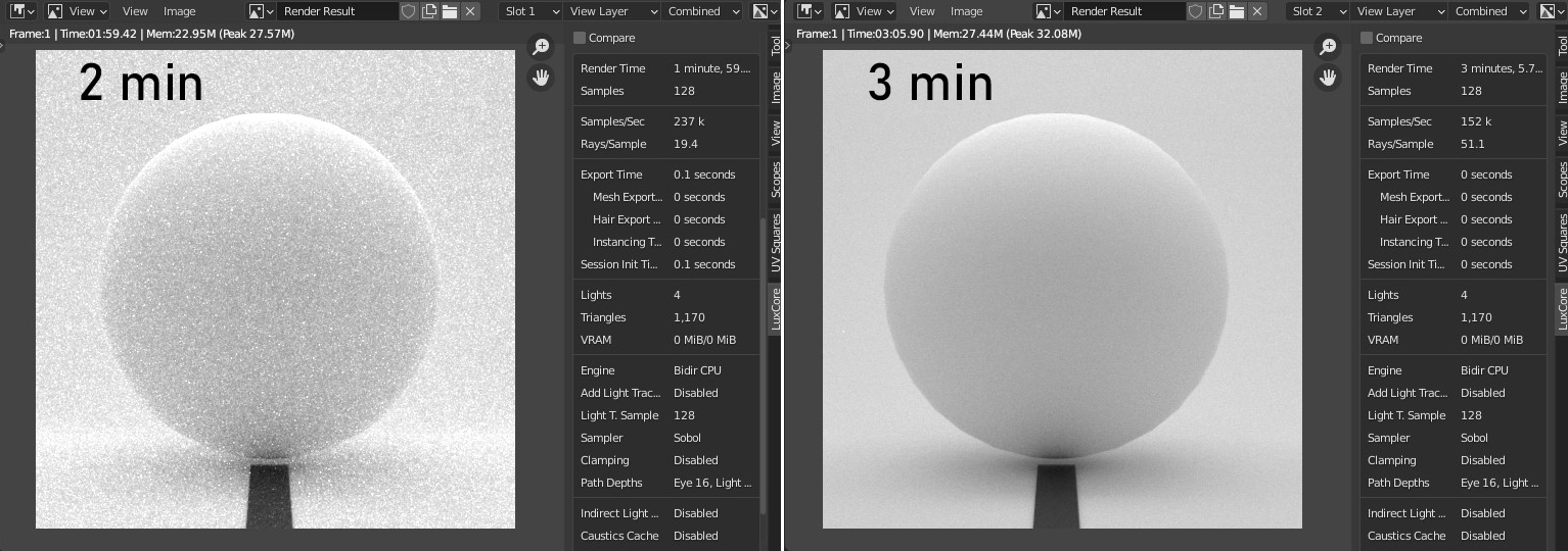 rendertime doesn't really matter here as even in 3min you can't reach same noise level with disney.