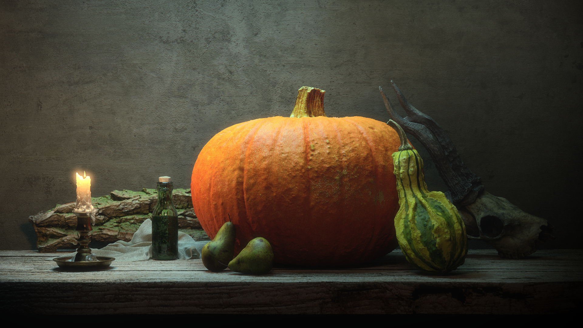 Heterogeneous volumetric clouds rendered based on BYOB nodes. Old movie vibe using LUT. Grain movie noise added in photoshop. Regular Path, about 700spp, no denoise, no hdri. Secondary image: I've tried to achieve an old painterly look. A mood that is similar to Anatoly Che's photographs. Regular Path (Bidir creates some weird bottom reflection in the big pumpkin after adding environmental volumetrics), about 500 spp, no denoise, no hdri, 2 main area lights + small point in the candle.