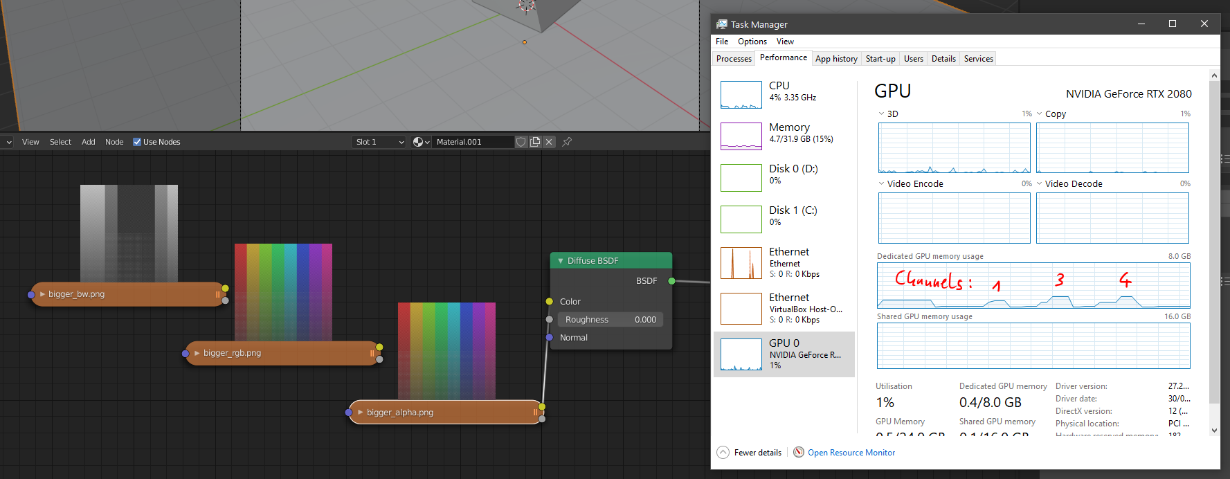 I did a test with the following scene:Dade wrote: Mon Feb 08, 2021 5:05 pm I'm guessing Cycles stores RGB (i.e. 3 channels images) as 4 channels, wasting a 33% of GPU memory. Can someone confirm this ? It shouldn't be hard to test by using a very large texture map with 3 or 4 channels and checking the amount of GPU memory used: if the amount is the same, my theory is confirmed.