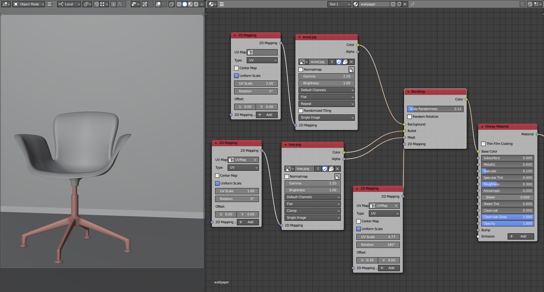 Texture bombing node both in the chair material and the wallpaper wall.