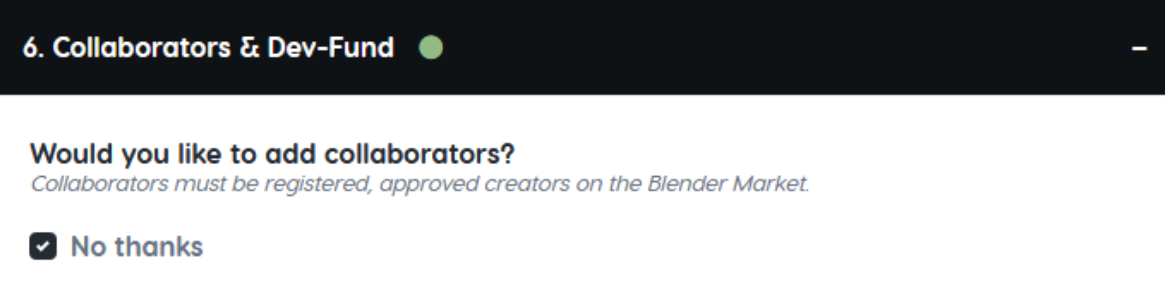 on blendermarket i think that the min price you can ask for it is $1 but you can link to the github or website where it is free so yes it is allowed. and to distribute the money around the entire team or how you guys would want they do have a option for that it is called add collaborator as seen hereDade wrote: Wed Jun 16, 2021 10:37 amI assume the original post was intending to use BlenderMarket as an additional way to collect donations. Anyway, do they allow free stuff to be placed there ? They gain no money so it sounds like something they are not allowingTAO wrote: Tue Jun 15, 2021 11:35 pm Even for free assets or plugins, we should do the same process?![]()