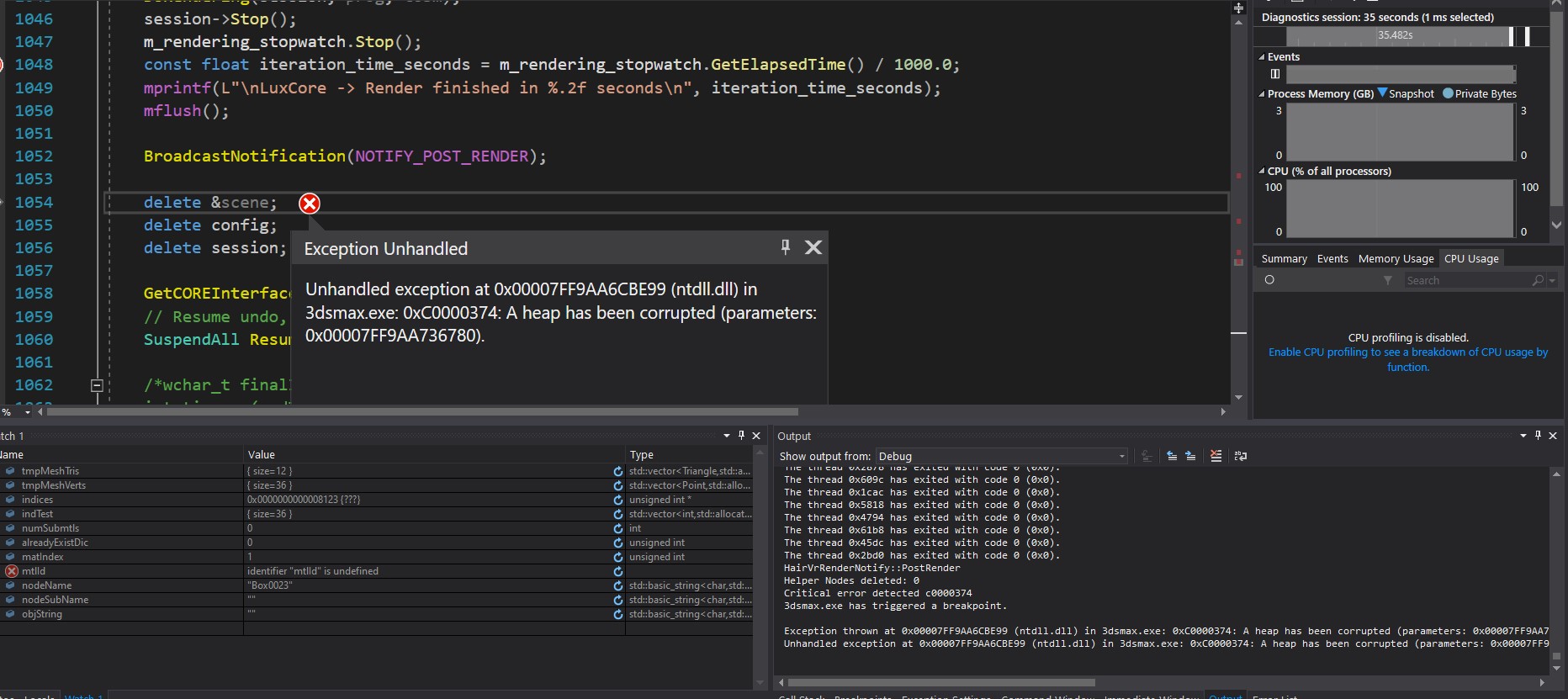 I noticed if I cancel the render too quickly normally before 50 passes 3dsmax will crash and the compiler will show me the error about "a heap has been corrupted" with a pointer on Luxcore::Scene and critical error number C0000374. The problem will appear just if I cancel the render too quickly or hit the render too many times. By the way, after 100 passes or so, never happened.