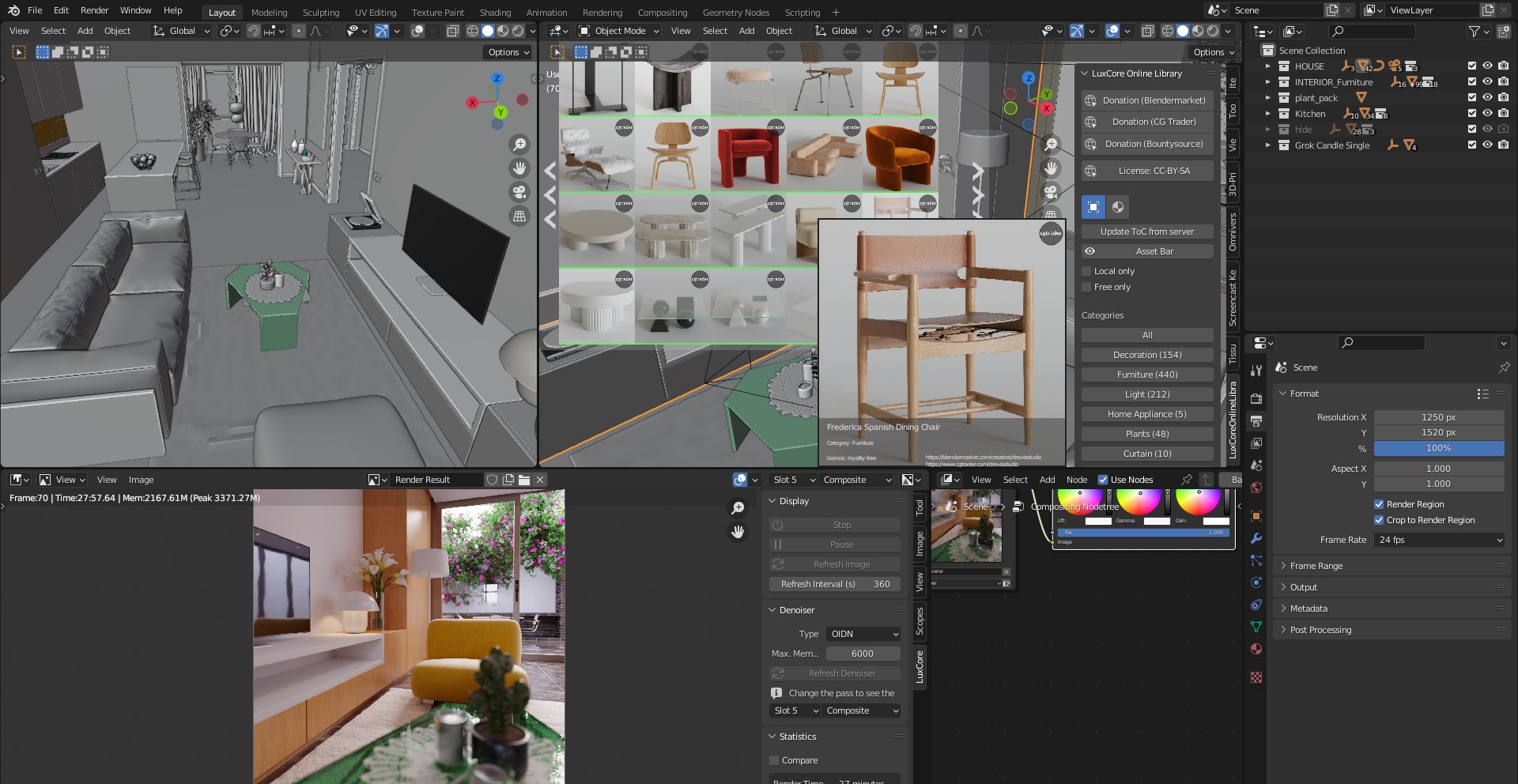 The design phase was quite straightfoward as i didn’t have to model or recreate shaders thanks to the Luxcore integrated Library : https://www.cgtrader.com/draviastudio