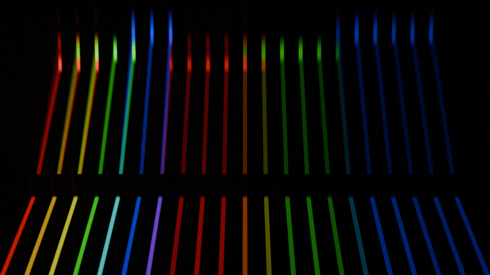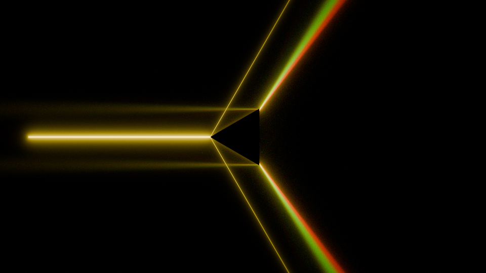 Sample of 'laser' lights going a through a prism and the dispersion hitting a screen. Volume scattering is used to visualize light beams.
