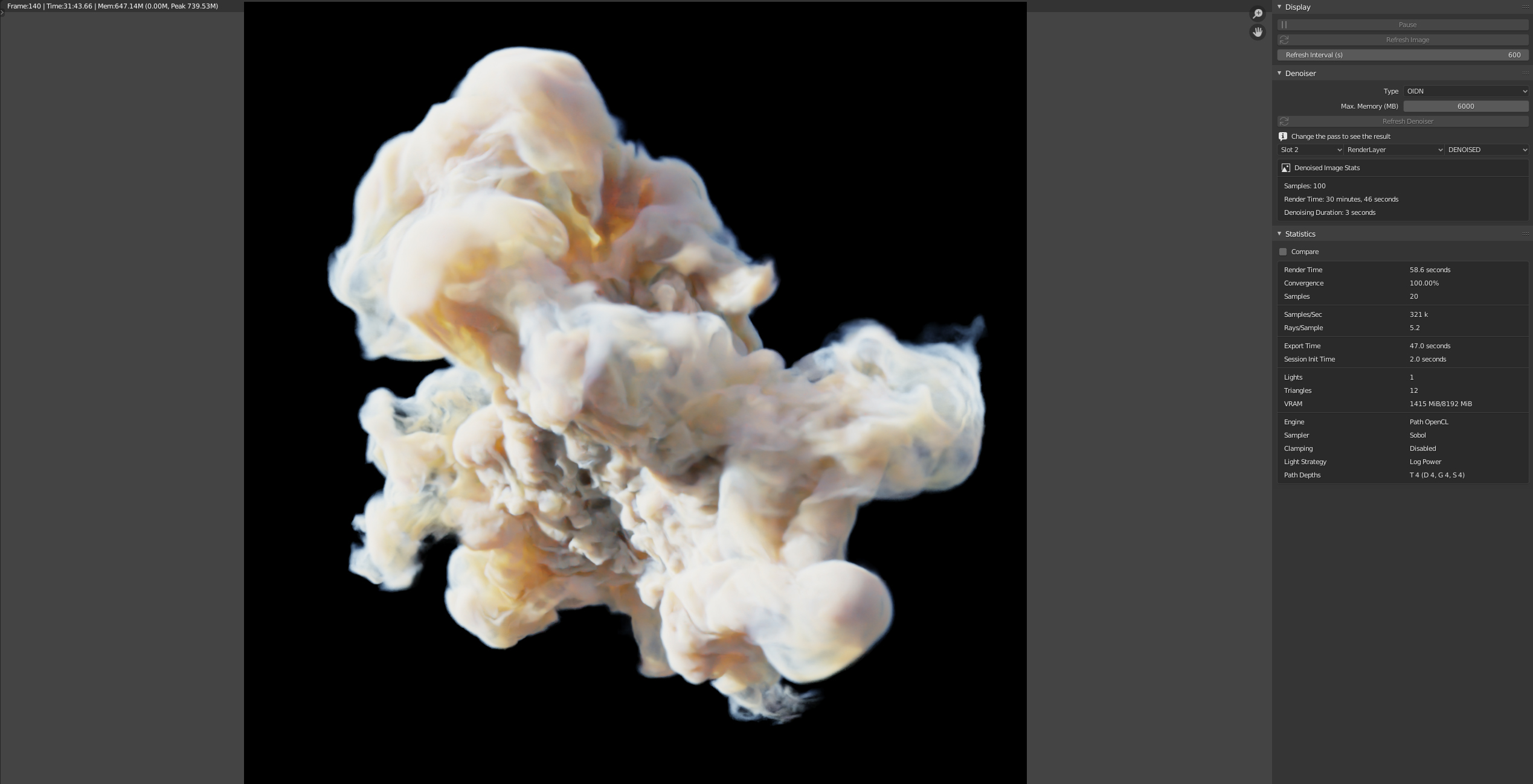 Multi-scattering is a beauty.pixel_peeper wrote: Mon Jan 27, 2020 3:54 pm Heterogeneous Volume with Multiscattering (render time is 31:46, I don't know why the statistics panel shows 0:58)