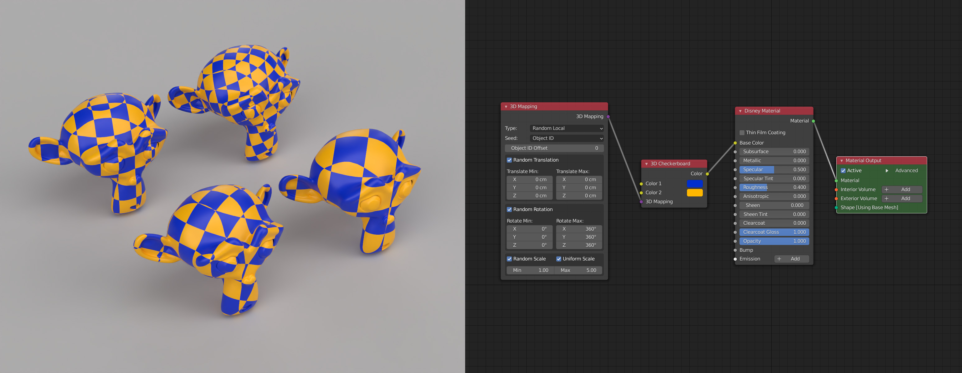 While I was testing the 3D Mapping with Triplanar Mapping is was obvious that the random rotation isn't working too well. I could work around it with individual 2D mappings, but a smarter way would be to maybe adapt the 3D Mapping node a bit.