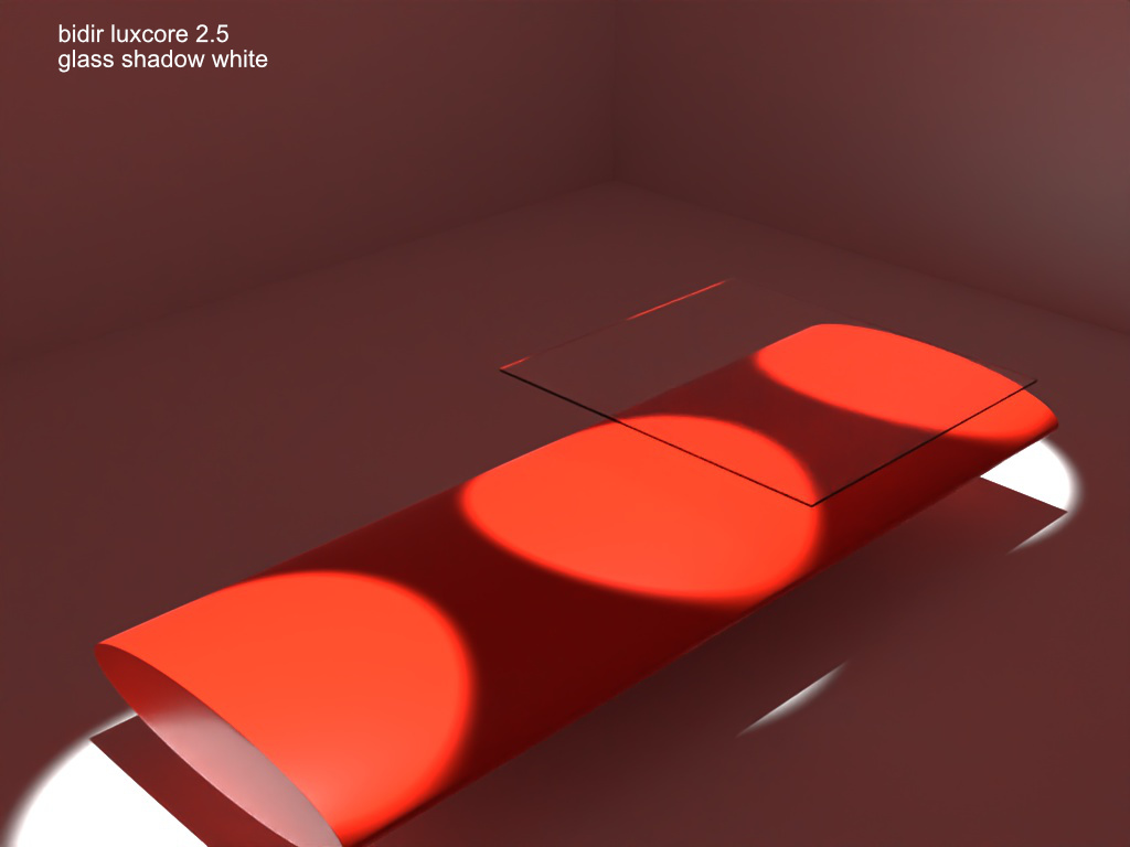 In blendlucore 2.5 using bidir you just need to make the glass shadow color white, it matches the result of version 2.61 using path where the glass shadow is also white and only photon cache enabled(light tracing and caustic cache disabled). In those two examples the glass is not visible at all in the red capsule.