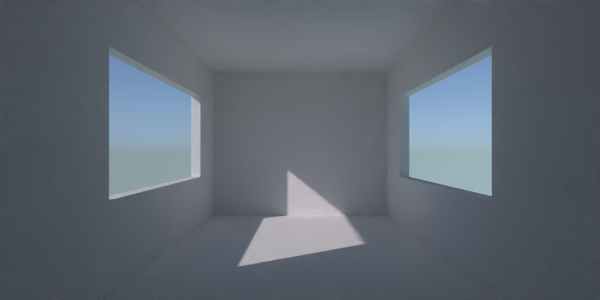 I would expect the last scenes looking very similar to the first one, letting all direct sun and sky light in. Interesting is also the gradient artifact on the floor.