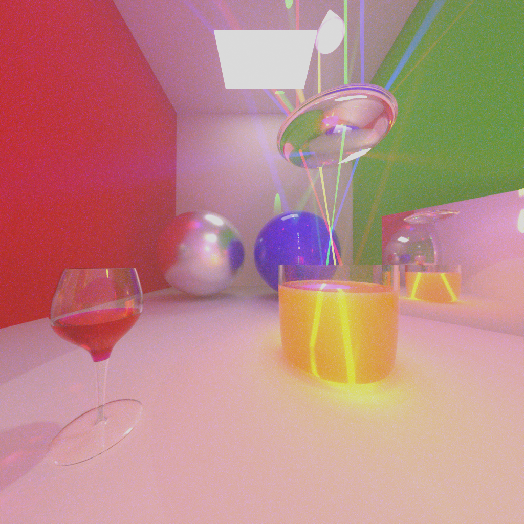 With Engine: BidirVmCPU and Sampler:Metropolis scattering of Laser works well in the orange juice.