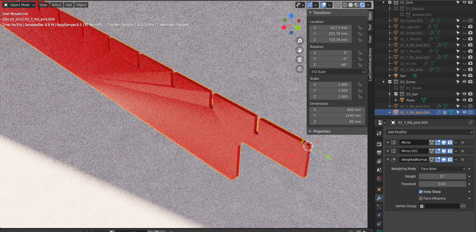 Hi. I am using a weighted normal modifier in my mesh in order to avoid the broken reflections of the mesh. I can see it works in the viewport, but not in the render. I am using lux 2.5 If this is not supported I will proceed to model the mesh only with quads and subdivision modifier. I was trying to avoid complex topology since its just a flat plane with thickness and bevel edges.