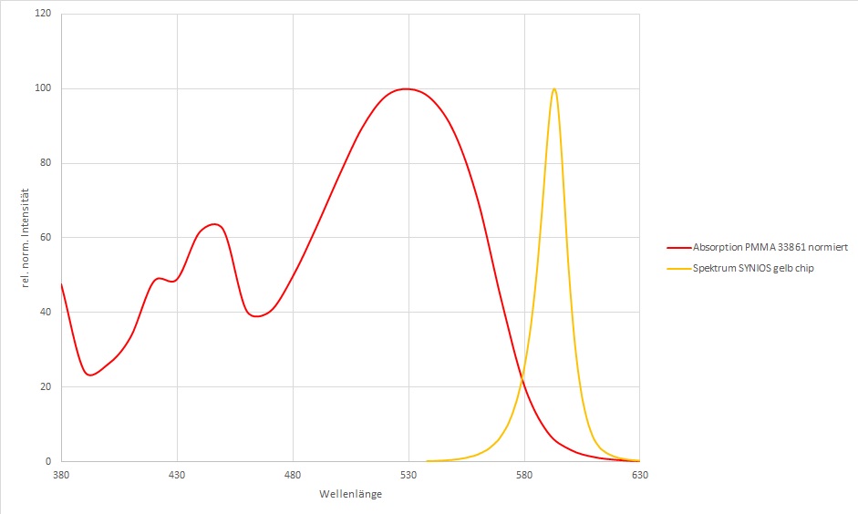 The following image shows the absorption of the red acrylic and the spectrum of the light source.