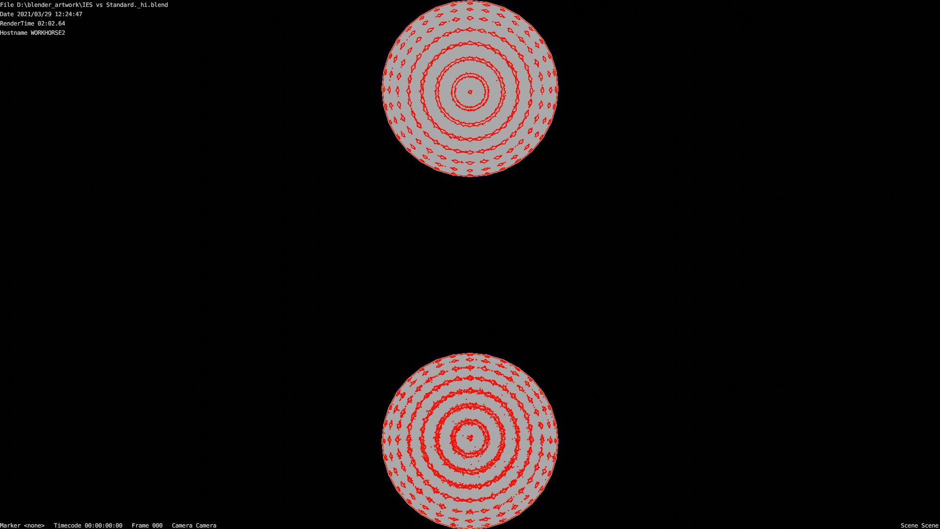 For the Blender setup two point white light sources with 80 candela intensities (Luxcore IES Lights and Luxcore Point Source light) and each is situated at the center of two similar 100% matte hemisphere objects with radii of 1 meter. For rendering Total Path Depth is set to 1 to disable all indirect bounce lights inside the hemisphere.