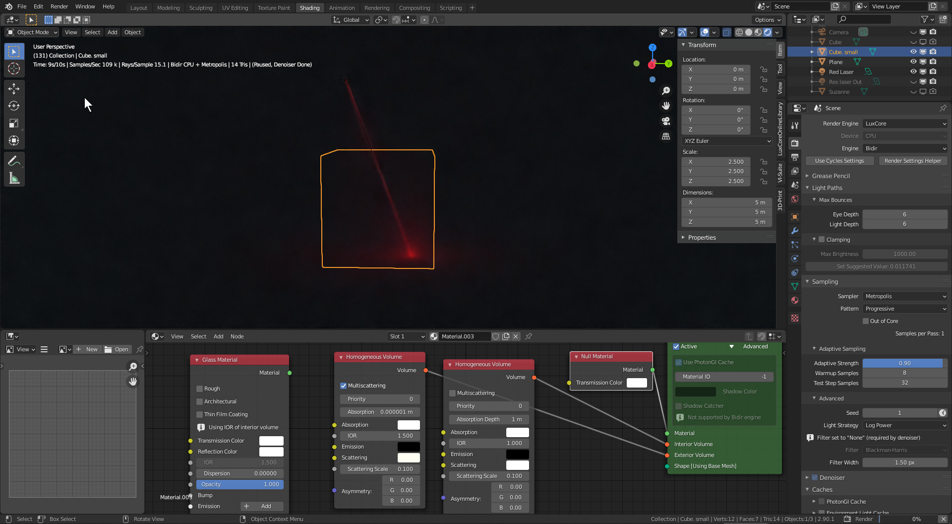 Thanks Dade. I got the laser beam refraction and reflection through glass almost working now by hiding the Glass Object from Camera. There's still something strange however and I cannot get the beam to come out visible from the glass cube beneath. That means no more light scattering after coming out and returns only after hitting and bouncing back on a Matte Plane Object???