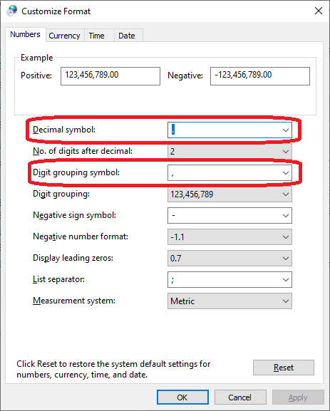Normally the first setting (decimal symbol) is "," in European countries, while the "digit grouping symbol is "."